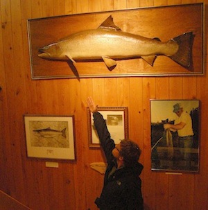 A year ago 40,000 salmon came up the river, last year it was 60,000. The average salmon would be 9 to 23 lbs, the largest caught in this in this river so far was a little more than 50 lbs. On the wall of Doaktown’s Atlantic Salmon Museum you can see a replica of a 72 lb salmon caught in the Restigouch River to the north. Photos of Atlantic Salmon Museum & Salmon fishing by Lucy Izon |